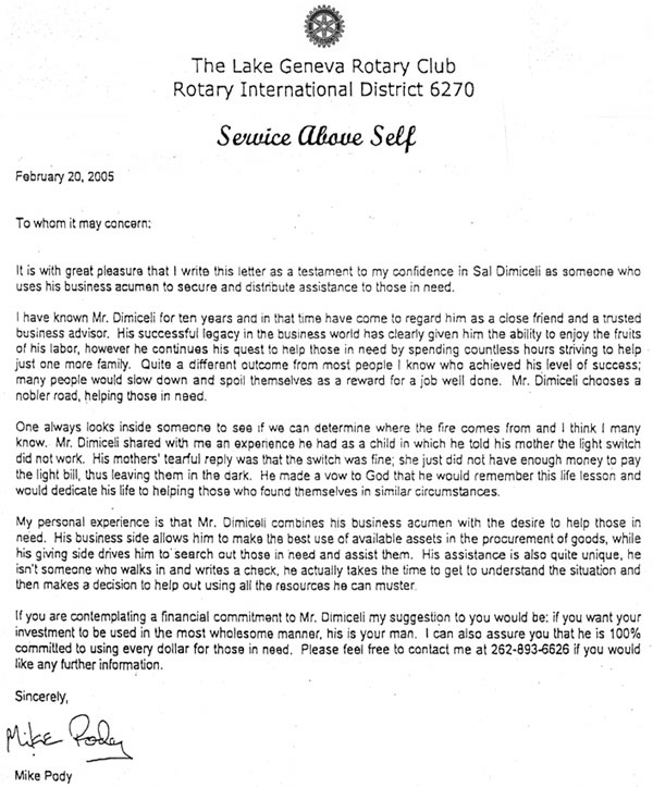 Letter from Lake Geneva Rotary Club |